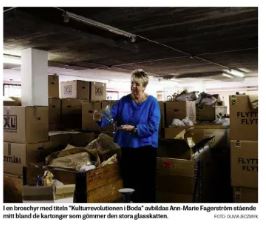Inför öppningen av museet fotograferas kommunalrådet bland flyttlådor i trä och papp med en skir glasskål i händerna. En del av den stora glasskatten.